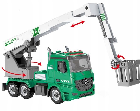Auto służby miejskie z koszem na wysięgniku. Auto jest kompatybilne z popularnymi klockami, wydaje realistyczne dźwięki , świeci.