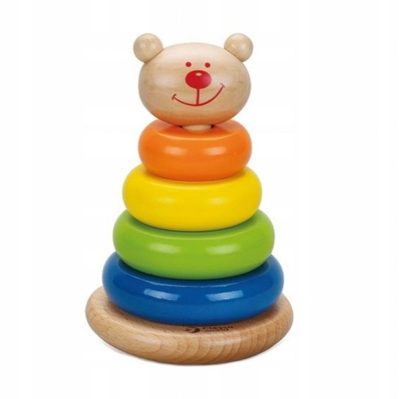 - Drewniana zabawka, która przedstawia uśmiechniętego misia. Jest to genialna piramidka typu stacker, która jednocześnie spełnia kilka funkcji bardzo ważnych dla dzieci w wieku ok. 12 miesięcy.