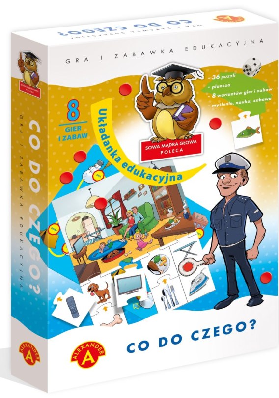 "Co do czego" to zbiór zabaw i gier, a jednocześnie pomoc dydaktyczna dla dzieci w wieku przedszkolnym. W opakowaniu znajdują się 4 zestawy puzzli, kolorowa plansza, żetony, pionek, kostka i instrukcja. Każdy zestaw składa się z dużej karty z ilustracją, do której dopasowanych jest 8 mniejszych puzzli. Różne warianty zabawy, podczas których należy skojarzyć ze sobą właściwe puzzle, rozwijają u dzieci spostrzegawczość, koncentrację, refleks, pamięć, wyobraźnię, logiczne myślenie oraz sprawność manualną. Dzieci mogą bawić się indywidualnie lub w większym gronie. Dobrze jeśli w zabawie towarzyszy dzieciom opiekun, który wskazuje różne wersje zabawy i pomaga w trudniejszych zadaniach.