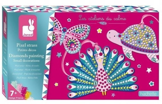 Zestaw kreatywny Cudowne kryształki Dekoracje zwierzątka francuskiej marki JANOD zawiera 3 nieduże obrazki w kształcie pawia, motyla i żółwia. Można je – w wyznaczonych miejscach – ozdobić poprzez naklejenie dołączonych do zestawu maleńkich kryształków – jest ich aż 450 w pięciu kolorach: białym, jasnym i ciemnym różowym, jasnoniebieskim i żółtym, a także specjalny „długopis” do ich nanoszenia. W komplecie znajduje się też 9 większych kryształów – 3 okrągłe i różowe oraz 6 niebieskich w kształcie łezek, do wykończenia ozdób, a także 3 różowe tasiemki do ich zawieszenia. Przyklejanie kryształków to dla dziecka długie godziny angażującej i jednocześnie uspokajającej, wyciszającej zabawy, a gotowe obrazki będą wspaniałym elementem dekoracyjnym dziecięcego pokoju.