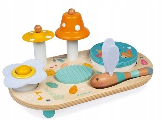 Drewniany ministolik muzyczny z serii Pure francuskiej marki JANOD to idealny zestaw pierwszych instrumentów dla dziecka, który pomaga rozwijać słuch, poczucie rytmu i zdolności muzyczne, a przy tym wielofunkcyjna zabawka, która nieprędko się znudzi. Na zaokrąglonym podeście na nóżkach znajduje się m.in. dzwoneczek w kształcie stokrotki, perkusja złożona z dwóch muchomorów, wyjmowany bębenek z grafiką stawu z rybkami, tarka oraz wyjmowana drewniana pałeczka – ważka z filcowymi skrzydłami. Zabawka wspiera rozwój motoryki i wyobraźni, koncentracji i koordynacji ruchowej. Ma piękną pastelową kolorystykę.