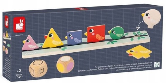 Drewniana układanka edukacyjna Ptaki francuskiej marki JANOD to zabawka, która umożliwia sortowanie wg kształtów, kolorów i rozmiarów. Rozwija przy tym wiele kluczowych umiejętności, m.in. rozróżnianie i dopasowywanie do siebie przedmiotów czy tzw. małą motorykę. Uczy także skupienia, spostrzegawczości i cierpliwości. Zestaw składa się z dwóch podłużnych drewnianych podstawek-gałązek z 6 otworami każda, w których można umieszczać wybrane elementy, zgodnie ze wskazówkami, 72 ptaszków w różnych wielkościach, kolorach i kształtach geometrycznych oraz dwóch kostek do rzucania: jednej, wskazującej kolor i drugiej – kształt oraz wielkość elementów, które należy ustawiać na podstawce lub podstawkach. Zabawką można się bawić w pojedynkę lub we dwójkę, ścigając się lub stawiając sobie wzajemnie wyzwania.