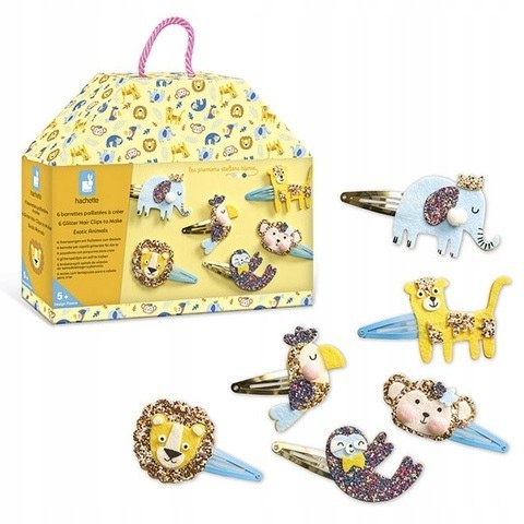 Zestaw kreatywny do tworzenia spinek do włosów Egzotyczne zwierzęta francuskiej marki JANOD pozwoli stworzyć w sumie 6 sztuk wspaniałych ozdób (ze słoniem, tukanem, małpką, leniwcem, lwem i tygrysem). W jego skład wchodzi 6 metalowych spinek do włosów (złotych i niebieskich),  3 filcowe oraz 2 samoprzylepne brokatowe arkusze z wstępnie wyciętymi kształtami oraz 1 biały i 3 różowe mini pompony (i pianki do ich przyklejenia).