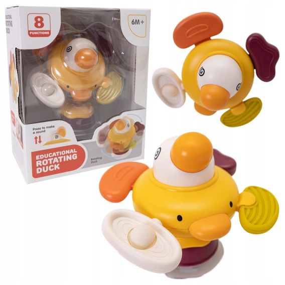 8 funkcyjna zabawka. Może być za pomocą przyssawki przyklejona do szyby, stolika, lustra i wówczas kręci się wokół swojej osi. Przy potrząsaniu grzechocze, naciskając głowę kaczuszki usłyszymy dźwięki. 4 ruchome sensoryczne wypustki o różnych fakturach, kolorach i kształtach. Jedna przesuwa się w pionie i poziomie wydając dźwięki, druga obraca się o 360 stopni i można silikonowy guziczek przepychać paluszkiem w górę i w dół, trzecia i czwarta oprócz tego, że są silikonowymi gryzakami można je wysuwać i wsuwać.