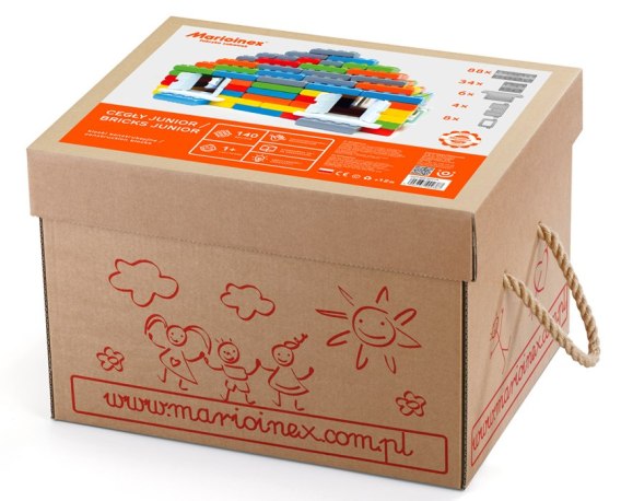 Zestaw klocków budowlanych "CEGŁY JUNIOR" składający się z 140 elementów (dwa rodzaje klocków podłużne i kwadratowe + elementy potrzebne do zbudowania okna i drzwi). Klocki zostały wykonane z bezpiecznego i trwałego materiału.