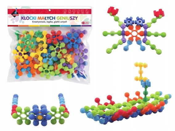 Edukacyjne klocki kulki 54 klocki w 8 kolorach pozwalają stworzyć fantastyczne, przestrzenne figury, zaczynając od tych prostych takich jak cyferki czy okulary poprzez nieco trudniejszego kraba lub statek. Zestaw zawiera 54 elementy w 8 kolorach.