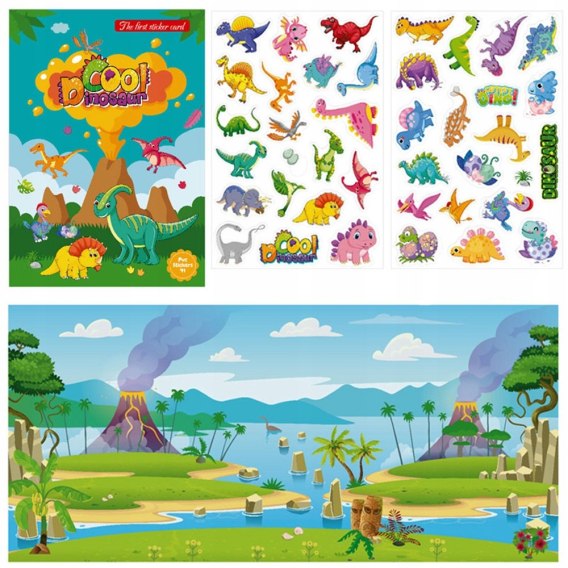 Książeczka z naklejkami dinozaurów, do wypełnienia w środku. W zestawie znajduję się 41 naklejek z dinozaurami.