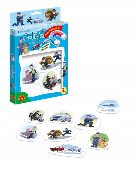 Magnesiaki Mała Policja to zestaw tematycznych obrazków, powleczonych magnetyczną folią na odwrocie. Dzięki temu obrazki można układać nie tylko na stole lub podłodze, można je również ustawiać na pionowej ścianie lodówki lub innych metalowych płaszczyznach. Serię wyróżnia przede wszystkim bardzo ładna grafika, duże rozmiary, oraz gruba tektura, pozwalająca dzieciom na łatwy chwyt. Strona z obrazkiem powleczona została folią, aby łatwo było je czyścić