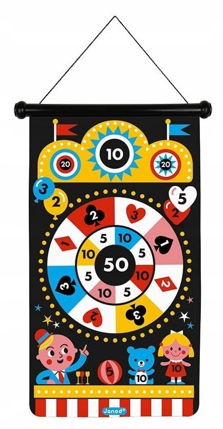 Magnetyczna gra w rzutki Wesołe miasteczko francuskiej marki JANOD to wspaniała zabawa dla dwojga – zarówno dzieci, jak i ich rodziców. Zestaw składa się ze zwijanej na rolkę tarczy ze sznurkiem do jej zawieszenia, np. na ścianie, oraz z 6 magnetycznych rzutek w dwóch kolorach (3 czerwone i 3 żółte). Czarna tkanina tarczy ilustrowana jest dwustronnie kolorowymi motywami typowymi dla strzelnicy z wesołego miasteczka, m. in balonami, kaczuszkami czy kołem fortuny. Rzutkami należy celować w tarczę z odpowiedniej, ustalonej przez graczy odległości, w taki sposób, by trafić w oznaczone na niej punktowane miejsca. Celem gry jest zgromadzenie w trzech rzutach jak największej ilości punktów. Gracz, któremu się to uda, wygrywa. Gra ta ćwiczy koncentrację i zręczność.