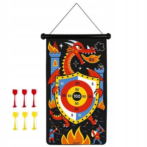 Magnetyczna gra w rzutki Smoki francuskiej marki JANOD to wspaniała zabawa dla dwojga – zarówno dzieci, jak i ich rodziców. Zestaw składa się ze zwijanej na rolkę tarczy ze sznurkiem do jej zawieszenia, np. na ścianie, oraz z 6 magnetycznych rzutek w dwóch kolorach (3 czerwone i 3 żółte). Czarna tkanina tarczy ilustrowana jest dwustronnie kolorowymi motywami ziejących ogniem smoków i atakowanych przez nie rycerzy i zamków. Rzutkami należy celować w tarczę z odpowiedniej, ustalonej przez graczy odległości, w taki sposób, by trafić w oznaczone na niej punktowane miejsca. Celem gry jest zgromadzenie w trzech rzutach jak największej ilości punktów. Gracz, któremu się to uda, wygrywa. Gra ta ćwiczy koncentrację i zręczność.