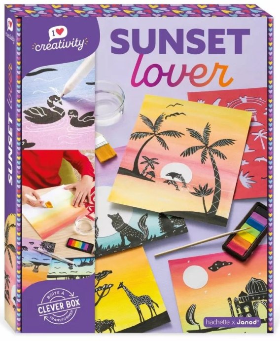 Zestaw kreatywny do malowania Zachody słońca z serii I love creativity francuskiej marki JANOD zawiera 5 projektów do wykonania – 5 plansz-płócien, na których można stworzyć niezwykłe krajobrazy według dołączonych wzorów. Paleta farb, 2 pędzle i szczoteczka, a także dwa dołączone szablony ze wzorami zwierząt, budynków, roślinności i innych motywów pozwalają na wykonanie widoków zachodu słońca. Ponadto sprytne opakowanie zestawu może stać się ramką 3D dla skończonego obrazka.