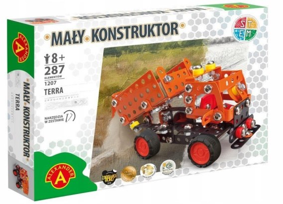 "Mały Konstruktor" to zabawka do samodzielnego montażu. Każdy model składa się z różnej wielkości i kształtów elementów metalowych, a także jest wzbogacony kolorowymi elementami z tworzyw sztucznych. Zestaw wyposażony jest w narzędzia, którymi można skręcić i rozkręcić pojazd.