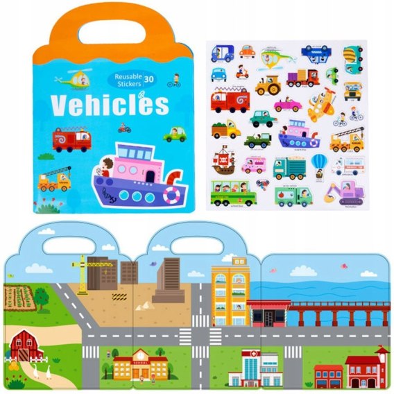 Książeczka z 30 naklejkami pojazdów, do wypełnienia w środku.