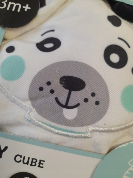 Na innym z pluszowych boków umieszczone jest lusterko, które zwraca uwagę niemowlaka, zachęca do chwytania kostki i poznawania swojego odbicia. Na jeszcze innym z boków doszyte są dodatkowe wstążeczki również stymulujące motorykę małą. Zabawka jest bardzo lekka i poręczna, łatwa do przechowywania, idealna do zabrania na spacer czy w podróż. Bez elementów plastikowych, można ją przymocować do łóżeczka czy wózka dzięki wstążeczkom.