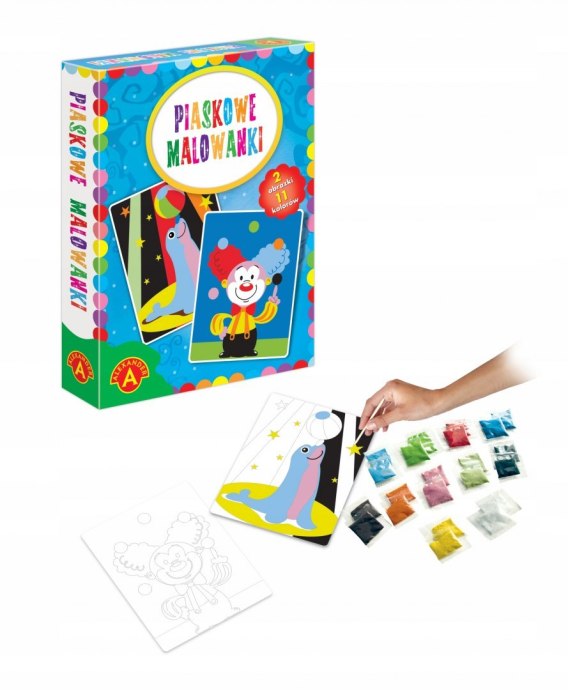 obrazki do kolorowania – 2 szt., patyczek, woreczki kolorowego piasku – 10 szt., instrukcja.