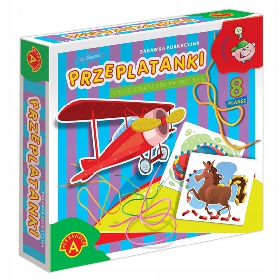 Przeplatanki to zabawa polegająca na przeplataniu kolorowego sznurka przez dziurki umieszczone na obrazku. Zabawka ćwiczy zręczność, cierpliwość, precyzję. Jest doskonałym wstępem dla dzieci do nauki wiązania butów oraz kokardek. Zestaw zawiera 8 dziurkowanych obrazków.