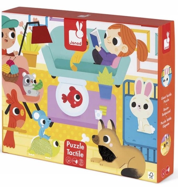 Duży zestaw puzzli sensorycznych francuskiej marki JANOD. Składa się z 20 elementów. Ułożony z nich obrazek przedstawia salon w domu, pełnym zwierząt. Są tu m.in. papuga, pies, żółw, królik, chomik czy rybka. Niektóre elementy ilustracji dziecko może poznać sensorycznie – sierść, pióra, skorupa żółwia czy abażur lampy wykonane zostały z teksturowanych materiałów. Dotykanie różnorodnych tekstur imituje prawdziwe wrażenia empiryczne i rozwija dziecięcy zmysł dotyku. Wzbudza też dodatkowe zainteresowanie układanką. Pojedyncze puzzle mają spore rozmiary, a obrazek po ułożeniu ma 65 na 50 cm. Puzzle zostały wykonane z trwałego kartonu, a ich kształty ułatwiają dziecku łączenie elementów.