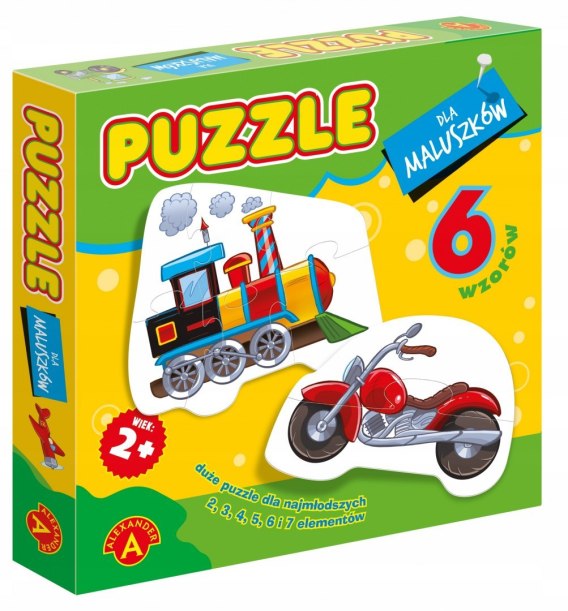 Puzzle dla maluszków to puzzle przeznaczone dla najmłodszych. W opakowaniu znajduje się 6 dużych układanek, które składa się z różnej liczby elementów – najprostsze układa się z 2 elementów, trudniejsze z 7. Dziecko stopniowo poznaje cel i sens zabawy, odkrywając zasady łączenia ze sobą poszczególnych części.