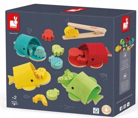 Do kompletu dołączone są też drewniane szczypce do chwytania owych stworzonek i umieszczania ich w paszczy odpowiadającego im kolorem wieloryba – na zasadzie sortera.