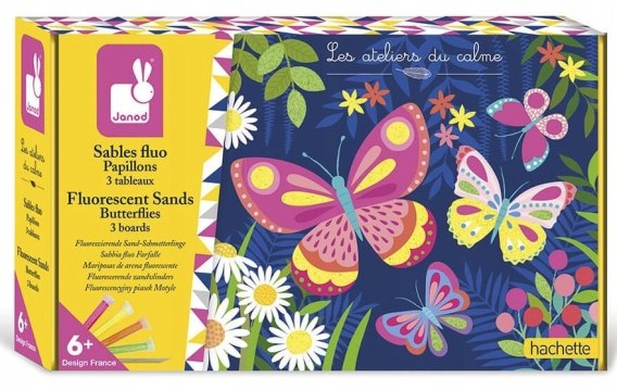 Zestaw kreatywny Fluorescencyjny piasek Motyle francuskiej marki JANOD zawiera 3 plansze-obrazki z tymi owadami. Ilustracje należy w wyznaczonych miejscach posypać dołączonym do zestawu piaskiem w tubkach, w 4 neonowych kolorach (żółty, pomarańczowy, różowy, zielony). Piasek przykleja się do obrazków, pozostawiając na nich drobnoziarnistą strukturę.