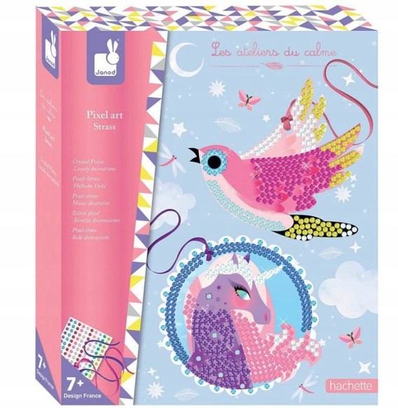 Zestaw kreatywny Cudowne kryształki Medaliony francuskiej marki JANOD zawiera 5 medalionów-naklejek o różnych kształtach, przedstawiających: egzotycznego ptaka, jednorożca, róże, ananasa i śpiącego kotka na księżycu. Ilustracje można ozdobić, naklejając – zarówno w sugerowanych miejscach, jak i dowolnie – dołączone do zestawu mini-kryształki. Jest ich aż 1500! Gotowe obrazki można przykleić w wybrane miejsce lub zawiesić na dołączonej wstążce (w komplecie jest ich 5, a wszystkie medaliony mają otwory na ich przewlekanie). Naklejanie to dla dziecka długie godziny angażującej i jednocześnie uspokajającej, wyciszającej zabawy, a gotowe obrazki staną się wspaniałym elementem dekoracyjnym dziecięcego pokoju.