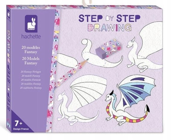 Zestaw kreatywny Rysowanie krok po kroku Fantastyczne stworzenia francuskiej marki JANOD zawiera 20 plansz ze wzorami do odwzorowania krok po kroku, 25 pustych kartek, ołówek HB i gumkę do zmazywania. Rysunki do odtworzenia przedstawiają m.in. smoki, feniksa i wiele innych baśniowych kreatur. Nauka rysunku krok po kroku to wiele godzin angażującej i jednocześnie uspokajającej, wyciszającej zabawy, a gotowe obrazki staną się wspaniałą dekoracją dziecięcego pokoju i powodem do dumy dla małych artystów..