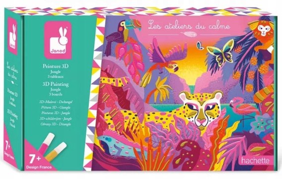 Zestaw kreatywny Malowanie farbami 3D Dżungla francuskiej marki JANOD zawiera 3 plansze-obrazki z barwnymi egzotycznymi sceneriami, na których widać małpy, słonie, tygrysy i inne dzikie zwierzęta. Ilustracje należy ozdobić za pomocą dołączonych do zestawu dwóch farb do malowania 3D, tj. ze strukturą. Farby – fuksjowa i złota – znajdują się w tubkach ze specjalnymi końcówkami, umożliwiającymi nakładanie ich w pożądany sposób. Dołączona instrukcja ułatwi wykonanie zadania. Technika malowania 3D to dla dziecka długie godziny angażującej i jednocześnie uspokajającej, wyciszającej zabawy, a gotowe obrazki staną się wspaniałym elementem dekoracyjnym dziecięcego pokoju.
