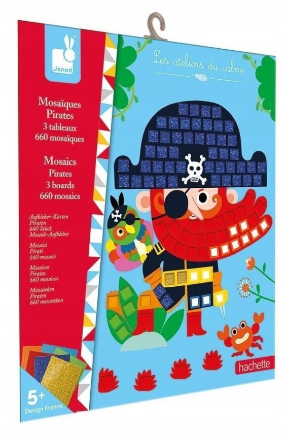 Zestaw kreatywny Mozaika Piraci francuskiej marki JANOD zawiera 3 kartonowe plansze-obrazki, które przedstawiają przygody piratów, m.in. sztorm na morzu i znalezienie skarbu na wyspie. Do ilustracji tych można – zarówno w sugerowanych miejscach, jak i dowolnie – przyklejać dołączone do zestawu drobne kwadratowe piankowe naklejki (ponad 700 sztuk!) w 6 różnych kolorach, w tym dwóch z efektem połysku (każdy na osobnym arkuszu). Naklejanie to dla dziecka długie godziny angażującej i jednocześnie uspokajającej, wyciszającej zabawy, a gotowe obrazki staną się wspaniałym elementem dekoracyjnym dziecięcego pokoju.